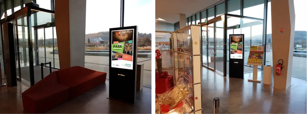 Ellipse Affichage Aquitaine a implanté dans le hall d’entrée et la boutique de Lascaux IV deux totems équipés de dalles numériques 48 pouces. Ce nouvel équipement valorise votre communication dans ce site ultra moderne.